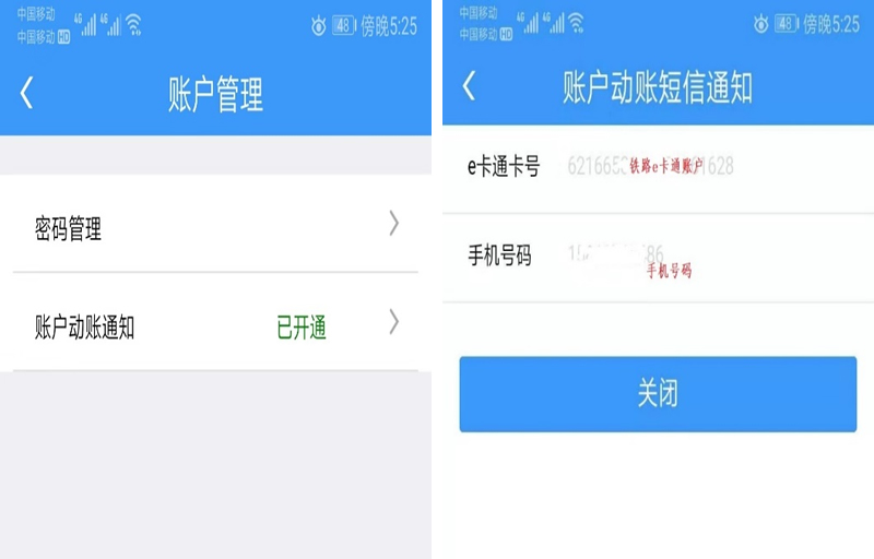 2.點(diǎn)擊賬戶動賬通知界面,顯示鐵路e卡通賬戶和手機(jī)號碼,選擇關(guān)閉將停止“鐵路e卡通”賬戶短信通知服務(wù)。