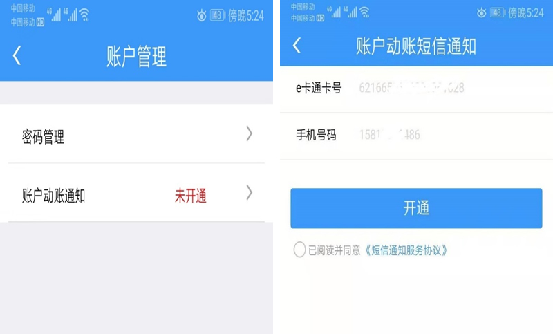 3.點(diǎn)擊賬戶動賬通知界面,顯示“鐵路e卡通”賬戶和手機(jī)號碼,選擇開通并勾選短信通知服務(wù)協(xié)議后點(diǎn)擊開通即可開通服務(wù)。