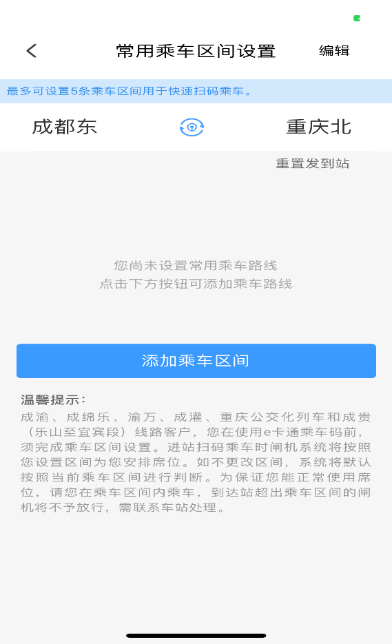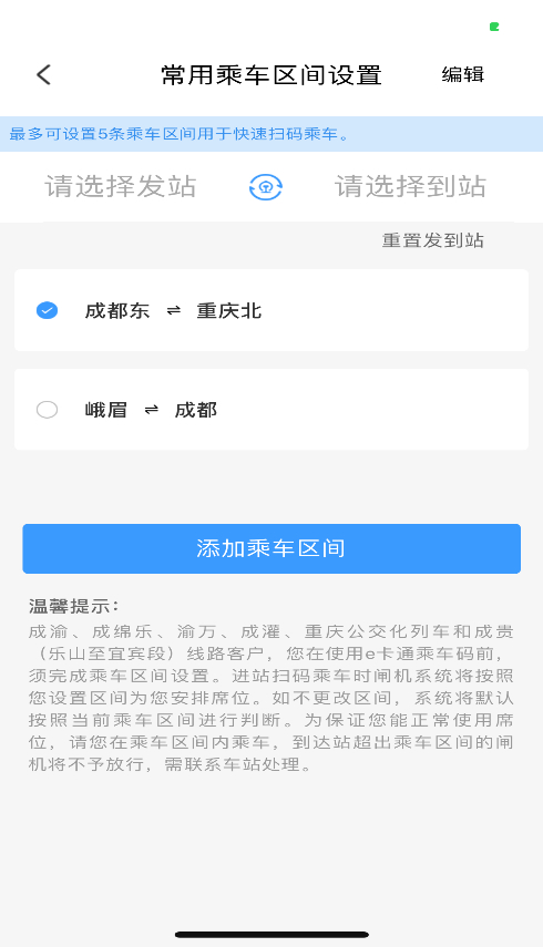 注意:川渝、西延、閩贛地區(qū)客戶,您在使用e卡通乘車碼前,須完成乘車區(qū)間設(shè)置。進(jìn)站掃碼乘車時閘機(jī)系統(tǒng)將按照您設(shè)置區(qū)間為您安排席位。如不更改區(qū)間,系統(tǒng)將默認(rèn)按照當(dāng)前乘車區(qū)間進(jìn)行判斷。為保證您能正常使用席位,請您在乘車區(qū)間內(nèi)乘車,到達(dá)站超出乘車區(qū)間的閘機(jī)將不予放行,需聯(lián)系車站處理。