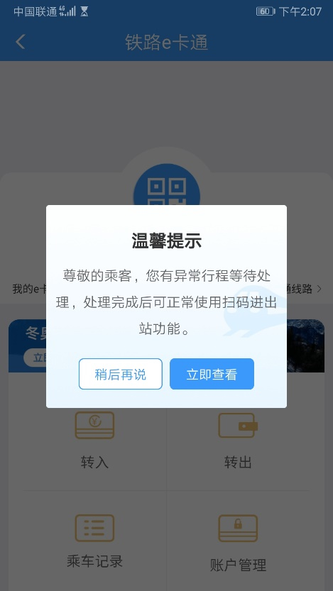 1、旅客如有異常行程,乘車碼無法展示,會一直有彈框提示。