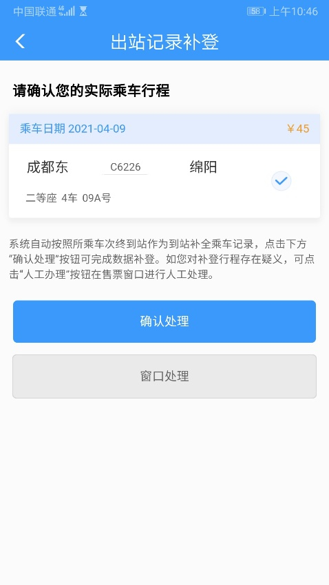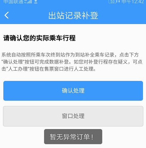 旅客選擇線上異常處理,選擇到站和車次,點(diǎn)擊確認(rèn)處理即完成異常記錄處理過程,可正常生成乘車碼并掃碼乘車。