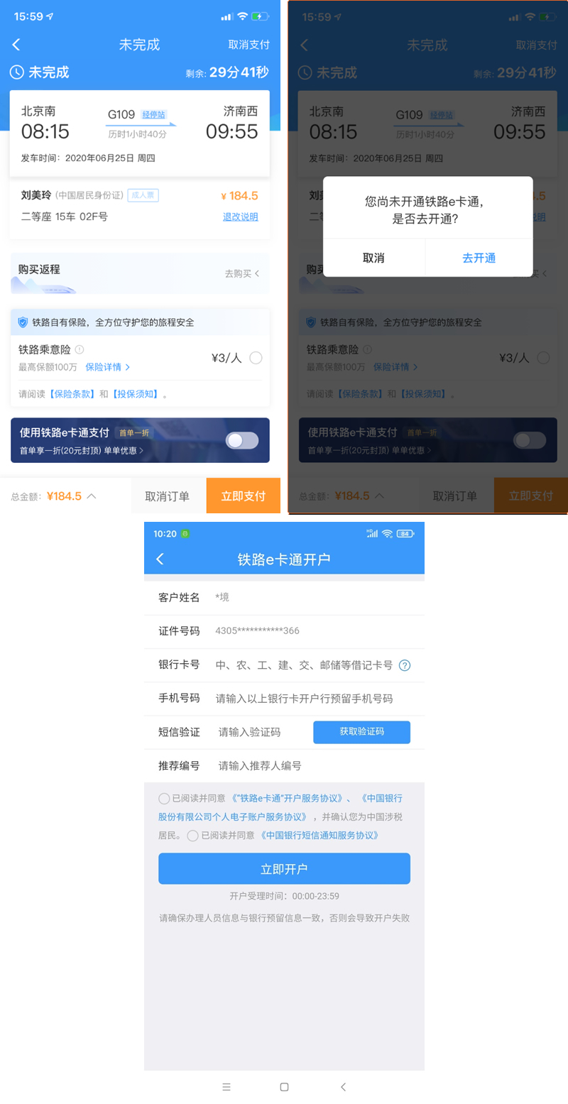 未開通“鐵路e卡通”用戶,在購票支付頁面時可以滑動開啟按鈕去開通“鐵路e卡通”賬戶。根據(jù)提示點(diǎn)擊“去開通”則跳轉(zhuǎn)鐵路e卡通開戶頁面,如果點(diǎn)擊取消停留在待支付頁面。