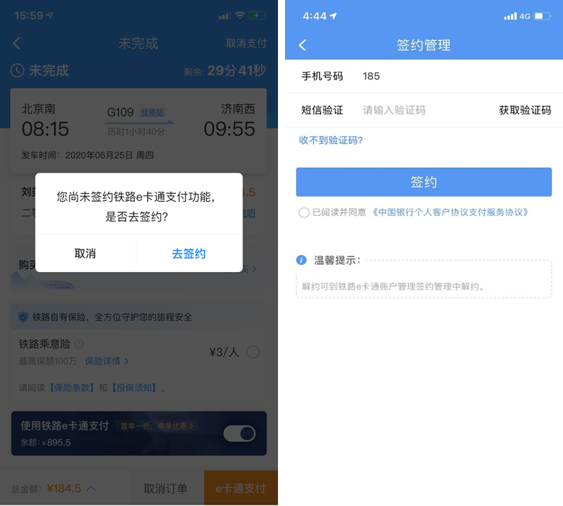 客戶滑動開啟按鈕提示旅客未簽約,引導(dǎo)旅客去簽約支付。去簽約跳轉(zhuǎn)到簽約界面,取消停留在待支付頁面。