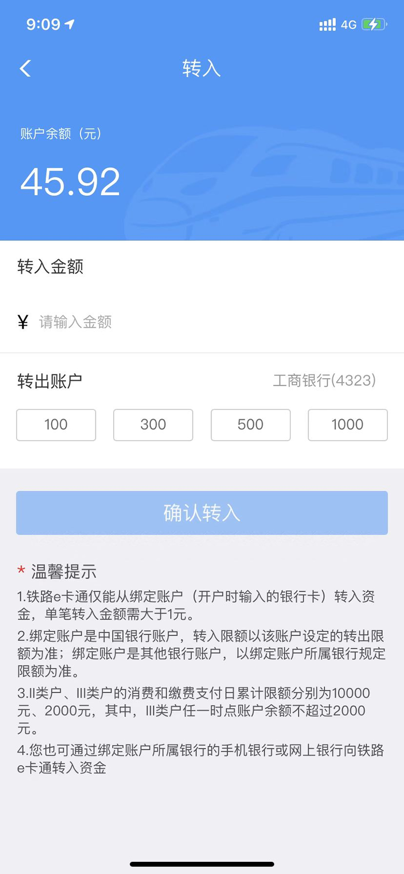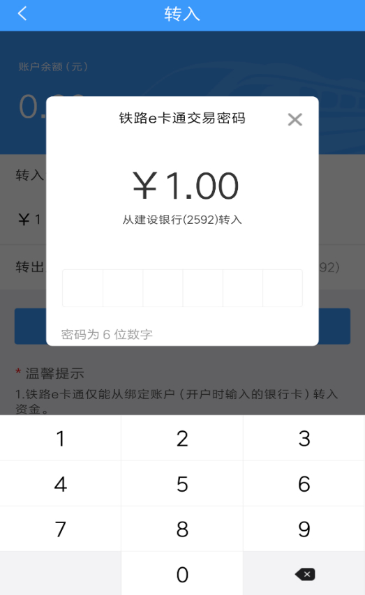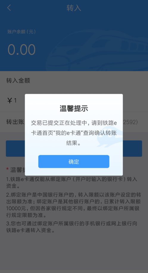 1.僅支持從綁定賬戶(開戶時輸入的銀行卡)向鐵路e卡通轉(zhuǎn)入資金。