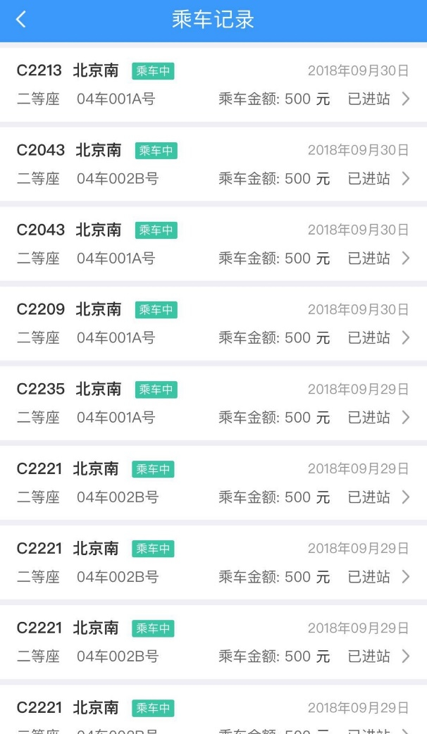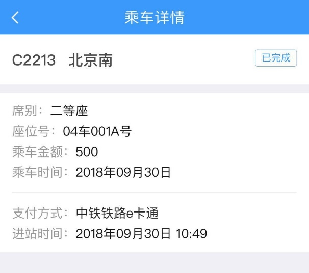 點(diǎn)擊每一條記錄還可查詢到詳細(xì)信息,包括:日期、車次、乘降狀態(tài)、發(fā)到站、席位、乘車金額等。
