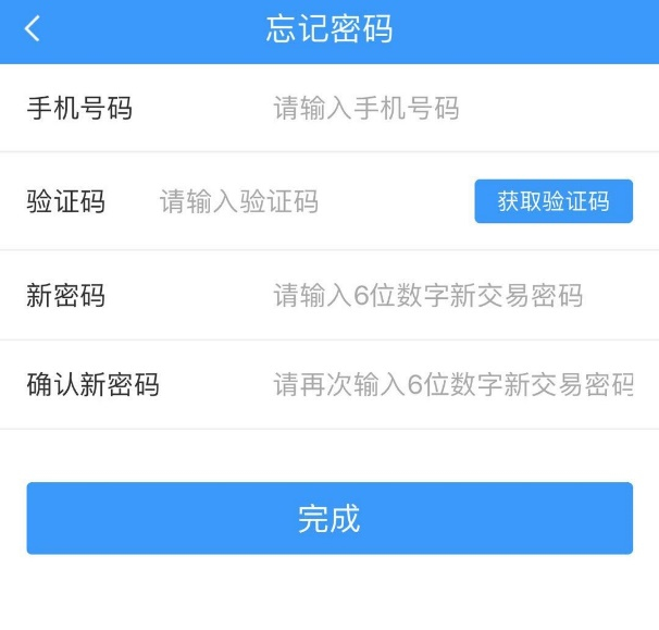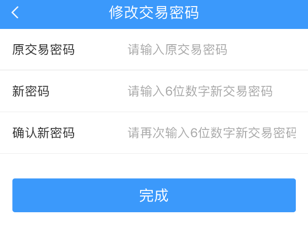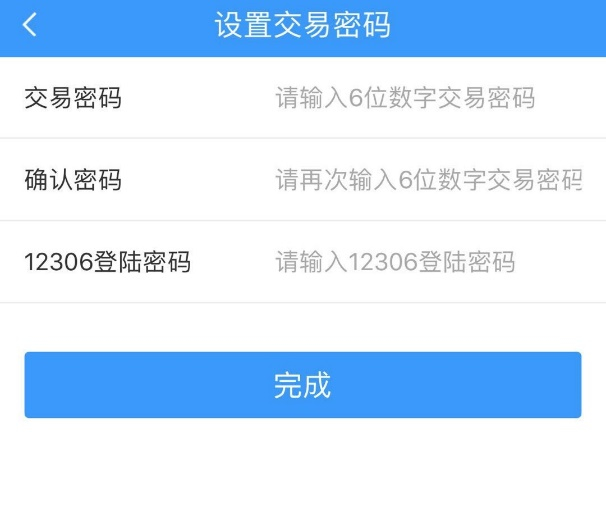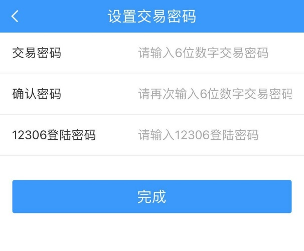 2.若客戶開戶后未設(shè)置交易密碼,首次辦理轉(zhuǎn)入業(yè)務(wù)時系統(tǒng)提示需首先設(shè)置“交易密碼”并自動跳轉(zhuǎn)至【設(shè)置交易密碼】頁面。兩次輸入六位數(shù)字交易密碼及12306登陸密碼,確認(rèn)后點(diǎn)擊【完成】。