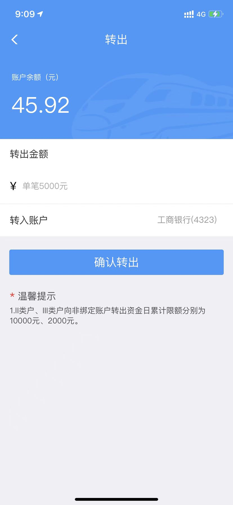 1.在鐵路e卡通首頁進(jìn)入【轉(zhuǎn)出】頁面。界面顯示當(dāng)前賬戶余額。